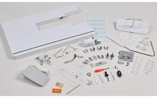 CX1 include un’ampia gamma di piedini premistoffa, tra cui il piedino regolabile per cerniere di nuova concezione, e un’ampia tavola di prolunga.